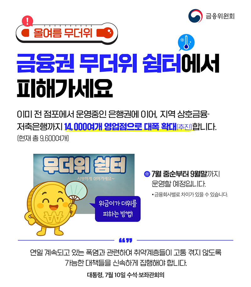 금융위원회에 따르면, 기존 9,600여 개였던 무더위쉼터가 2025년 여름 기준 14,000여 개로 늘어날 예정입니다. 은행, 지역 상호금융권 등이 영업점을 중심으로 무더위쉼터 기능을 수행하며, 실내 대기 공간에 냉방 장치를 가동하고 시민들에게 음료 제공, 안내 서비스 등도 함께 운영됩니다.