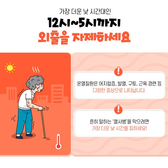 둘째, 시원하게 지내자. 실내는 적정 온도(26~28도)를 유지하고, 에어컨이나 선풍기 등을 적극적으로 활용해야 합니다. 외출 시에는 모자, 양산, 밝은색의 헐렁한 옷차림이 권장됩니다.