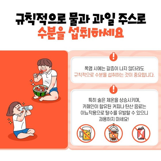첫째, 물을 자주 마시자. 갈증을 느끼지 않더라도 수시로 수분을 섭취해야 합니다. 카페인이나 알코올 음료는 피하고, 맹물 또는 이온음료가 좋습니다.