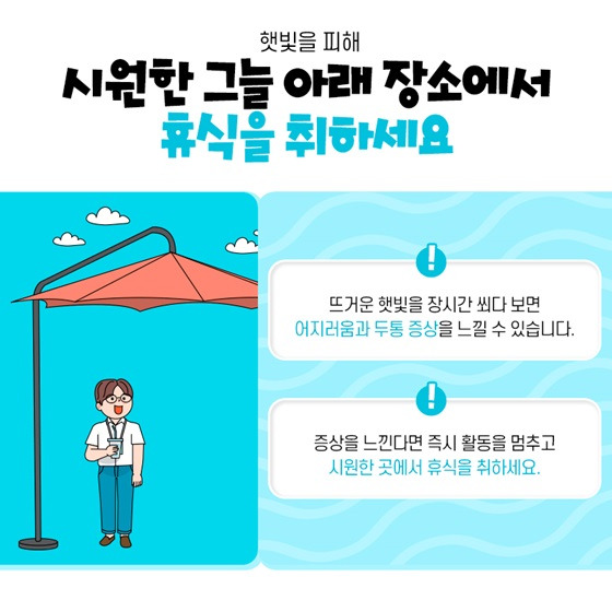 셋째, 더운 시간대에는 휴식하자. 오전 11시부터 오후 5시까지의 시간대는 가능한 외부 활동을 자제하고, 부득이한 경우 반드시 그늘에서 쉬는 시간을 갖도록 합니다.