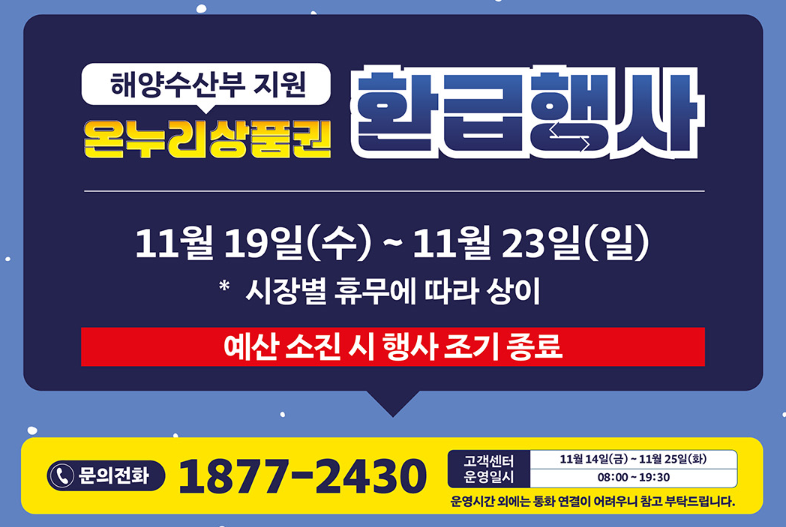 할인행사와 별도로 해양수산부는 19일부터 23일까지 전국 125개 전통시장에서 온누리상품권 환급행사를 추가로 운영한다고 발표했습니다. 이 지원은 김장 수산물 소비를 촉진하고 전통시장 내 활력을 회복시키기 위한 것으로, 전통시장에서 국산 수산물을 구매할 경우 구매 금액의 최대 30%를 온누리상품권으로 환급받을 수 있습니다.