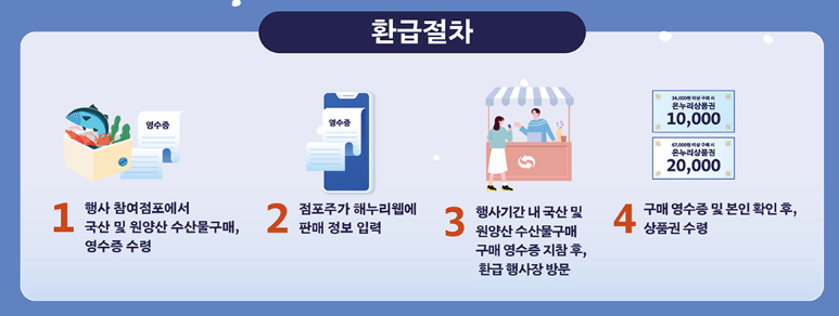 환급을 받기 위해서는 몇 가지 절차가 필요합니다. 전통시장에서 국산 수산물을 구매한 후, 해당 영수증을 지참해 시장 내 마련된 환급 부스를 방문해야 합니다. 이때 본인 확인을 위해 휴대전화나 신분증이 요구되므로 반드시 지참해야 하며, 일부 시장에서는 통합 안내 부스에서 구매내역 검증과 환급을 동시에 진행하는 방식도 운영됩니다. 영수증에 국산 수산물 구매 내역이 명확히 표시되어 있어야 환급이 가능하며, 품목 구분이 정확하지 않은 영수증은 환급 대상에서 제외될 수 있습니다. 따라서 구매 시 상인에게 품목 표기 여부를 확인하는 것이 좋습니다.