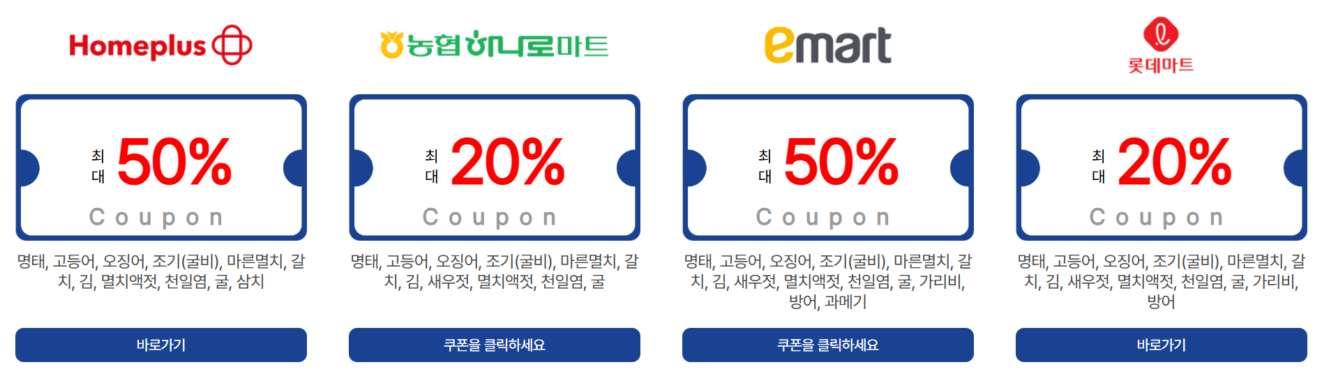 이번 행사는 오프라인 유통매장 19곳과 온라인몰 25곳, 총 44곳이 참여하며, 다양한 품목에 대해 최대 50% 수준의 할인이 적용됩니다. 천일염과 새우젓처럼 김장용 필수 품목뿐 아니라, 명태·고등어·굴·마른멸치 등 대중적인 수산물 품목까지 포함되기 때문에 김장 목적 외에도 일반 소비자들이 일상적으로 구매하는 수산물도 더욱 저렴하게 구입할 수 있습니다. 참여 업체는 지역 대형마트, 로컬 유통채널, 프랜차이즈 마트, 주요 온라인몰 등 폭넓게 구성되어 있으며, 구체적인 할인 대상 품목과 행사 기간은 대한민국 수산대전 공식 누리집에서 확인할 수 있습니다. 해당 사이트에서는 지역별로 참여하는 매장을 검색하거나, 온라인몰의 할인 적용 범위를 상세하게 확인할 수 있도록 구성되어 있습니다.