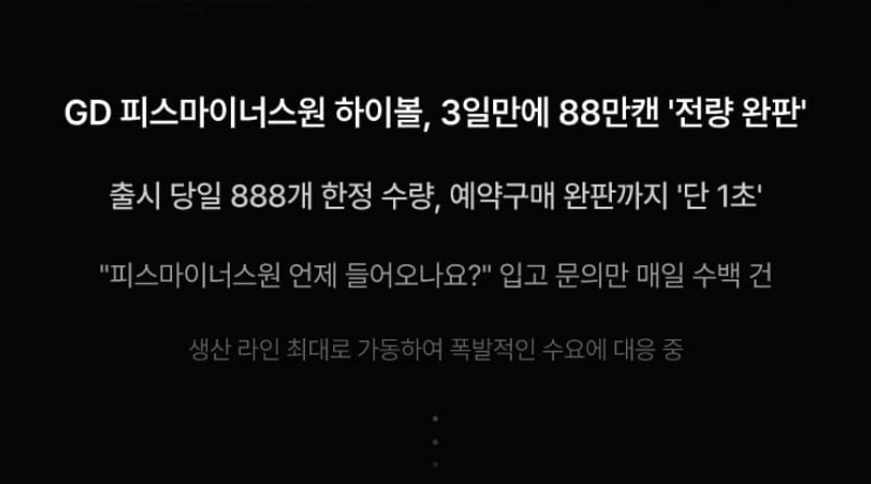 지드래곤(G-DRAGON)의 패션 브랜드 '피스마이너스원(PEACEMINUSONE)'과 편의점 CU가 협업하여 출시한 '피스마이너스원 하이볼'은 출시 직후 큰 인기를 끌며 초도 물량 88만 캔이 모두 판매되었습니다. 이 제품은 지드래곤의 취향을 반영한 와인 베이스의 생레몬 하이볼로, 피스마이너스원의 상징인 데이지 꽃 모양을 형상화한 생레몬 슬라이스가 들어간 것이 특징입니다.