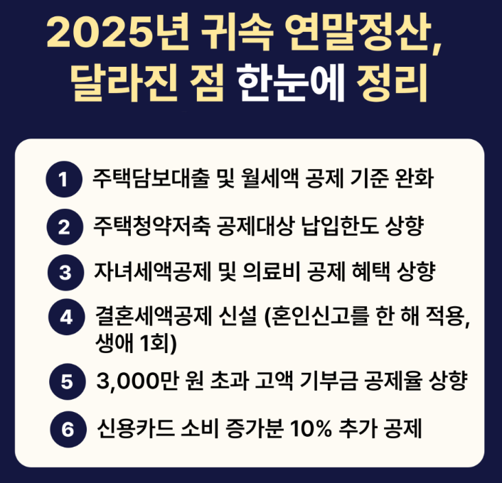 매년 반복되는 연말정산이지만, 매번 같은 기준이 적용되는 것은 아닙니다. 특히 2025년 귀속 연말정산은 자녀·가족 공제부터 주거비, 생활비, 기부금 공제까지 여러 제도가 동시에 바뀌면서 체감 혜택이 크게 달라졌습니다. 미리 내용을 정확히 알고 준비하지 않으면 받을 수 있는 공제를 놓치기 쉽고, 반대로 달라진 제도를 제대로 이해하면 환급액을 늘릴 수 있는 기회가 됩니다. 이번 글에서는 국세청이 공식 안내한 내용을 바탕으로 2025년 귀속 연말정산에서 무엇이 달라졌는지, 근로자가 반드시 챙겨야 할 핵심 포인트를 정리해 드립니다.